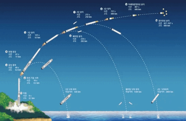 발사 현장의 실황 중계는 방송과 유튜브를 통해 밤 11시부터 시작된다. 발사의 모든 과정은 20여분 만에 종료된다. 이륙 뒤 2분5초에 1단 분리(고도 63㎞), 3분54초에 페어링(머리 부위 덮개) 분리(고도 202㎞), 4분32초에 2단(고도 258㎞) 분리가 순차적으로 이뤄진다. 이후 3단 발사체가 목표 고도 600㎞에 이르면 위성이 차례대로 사출된다. 발사 13분27초 뒤에 ‘차세대 중형위성 3호’가, 이후 약 20초 간격으로 큐브 위성들이 2개씩 분리된다.